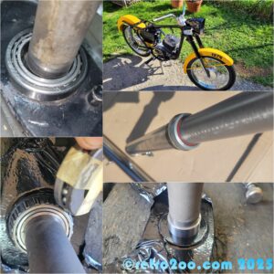 Mały tuning tj. zmiana łożyskowania główki ramy i uszczelnienie przedniego zawieszenia (2 uszczelniacze poliuretanowe robione na zamówienie). Łożyska kupiłem z Chin – wyszło taniej. Należało dorobić tulejki – te akurat podeszły z Ursusa.