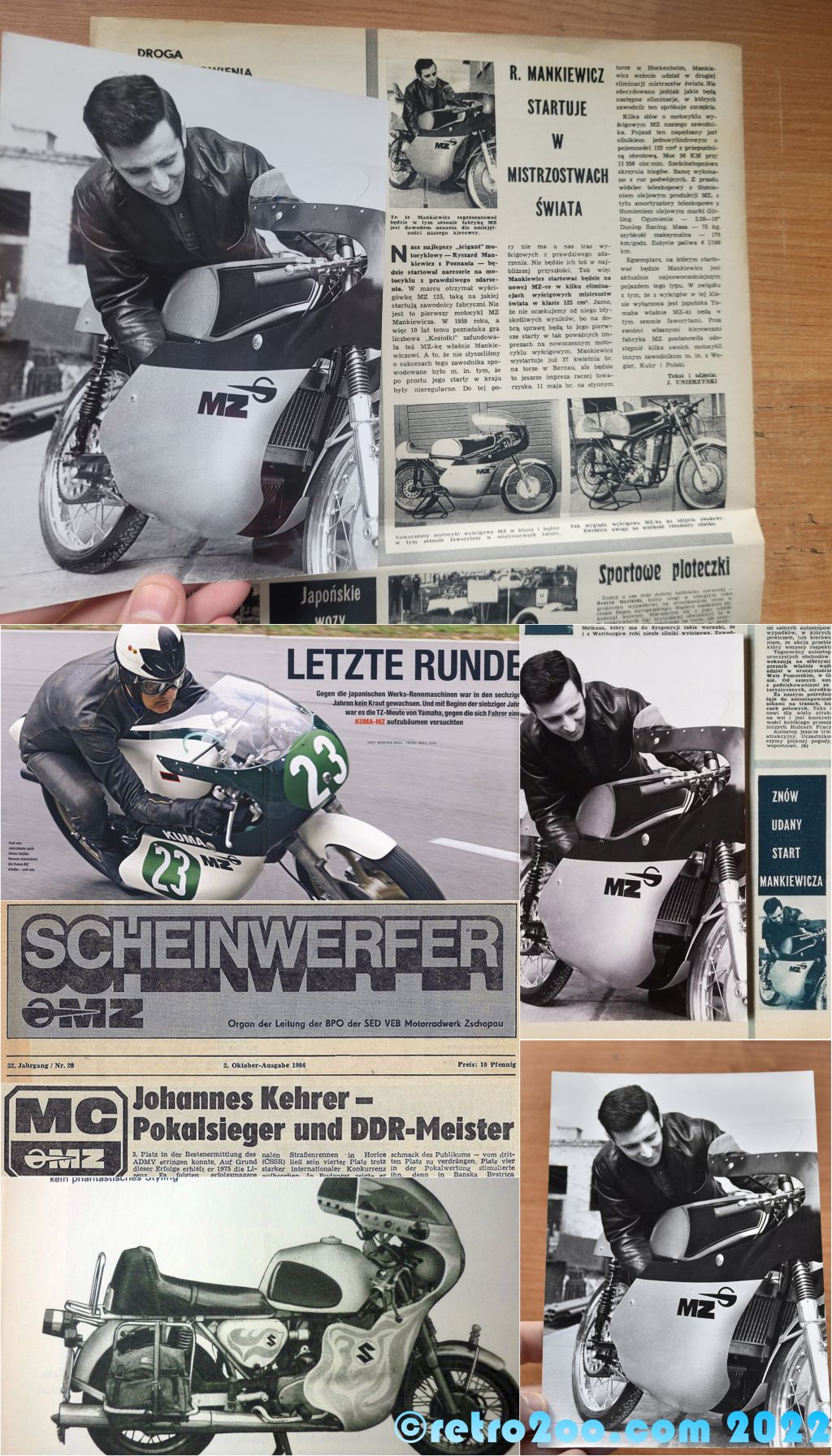 Nasz najlepszy „ścigant” motocyklowy — Ryszard Mankiewicz z Poznania — będzie startował nareszcie na motocyklu z prawdziwego zdarzenia. W marcu otrzymał wyścigówkę MZ 125, taką na jakiej startują zawodnicy fabryczni. Nie jest to pierwszy motocykl MZ Mankiewicza. W 1959 roku, a więc 10 lat temu poznańska gra liczbowa ,Koziolki” zafundowała też MZ-kę właśnie Mankiewiczowi. A to, że nie słyszeliśmy o sukcesach tego zawodnika spo¬wodowane było m. in. tym, że po prostu jego starty w kraju były nieregularne. Do tej pory nie ma u nas tras wyścigowych z prawdziwego zdarzenia. Nie będzie ich też w najbliższej przyszłości. Tak więc Mankiewicz startować będzie na nowej MZ-ce w kilku eliminacjach wyścigowych mistrzostw świata w klasie 125 cm”. Jasne, że nie oczekujemy od niego błyskotliwych wyników, bo na dobrą sprawę będą to jego pierwsze starty w tak poważnych imprezach na nowoczesnym motocyklu wyścigowym. Mankiewicz wystartuje już 27 kwietnia br. na torze w Bernau, ale będzie to jeszcze impreza raczej towarzyska. 11 maja br. na słynnym torze w Hockenheim, Mankiewicz weźmie udział w drugiej eliminacji mistrzostw świata. Nie zdecydowano jednak jakie będą następne eliminacje, w których zawodnik ten spróbuje szczęścia.