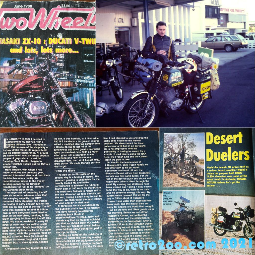 IN JANUARY of 1987 I decided to complement my R80 G/S with a slightly different bike. I bought an MZ 250 because of the simplicity of its two stroke motor, its rugged build and its oddball appearance. At around the same time I read an article about a couple of guys who crossed the Canning Stock Route.I began to wonder whether I could put the MZ to a similar test. Mark Wrigley, with whom I had ridden enduros the previous year, seemed interested also, and from there the idea became a reality. We committed ourselves to the trip by sending money to the Newman Roadhouse for fuel to be 'dumped’ on the Canning Stock Route.